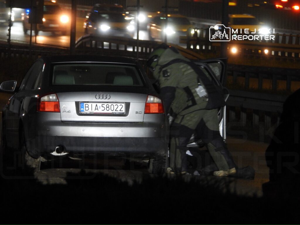Działania skupiały się na środku drogi serwisowej prowadzącej równolegle do trasy S8, w rejonie ulicy Warszawskiej. Na miejsce skierowano kilka załóg policji oraz pirotechników z Samodzielnego Pododdziału Kontrterrorystycznego Policji, którzy przejęli działania przy samochodzie Audi.