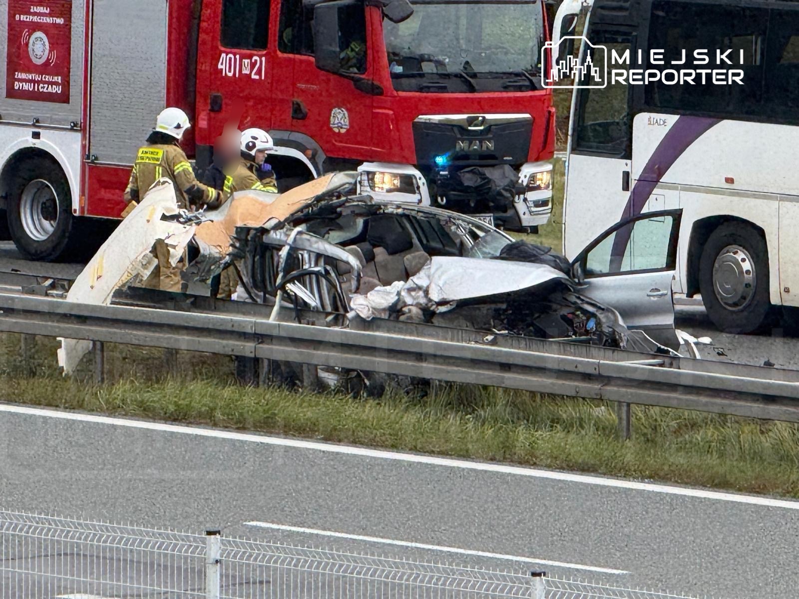 Kierowca volkswagena doznał obrażeń i trafił do szpitala. Osoby podróżujące autokarem nie odniosły obrażeń. Na miejscu pracują zastępy straży pożarnej, dwie załogi zespołów ratownictwa medycznego oraz policja.