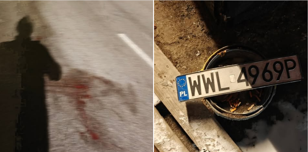 Na miejscu miały pozostać szczątki elementów auta: fragmenty plastiku oraz części oświetlenia. Świadek miał wykonać zdjęcia martwego zwierzęcia i szukać drugiego psa, którego początkowo nie udało się odnaleźć. Po chwili do mężczyzny miała podjechać kobieta, która przekazała mu tablicę rejestracyjną mającą pochodzić z pojazdu sprawcy. Następnego dnia – według aktualizacji w relacji – drugi pies miał zostać znaleziony martwy w rowie.