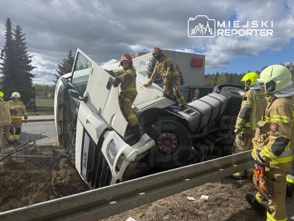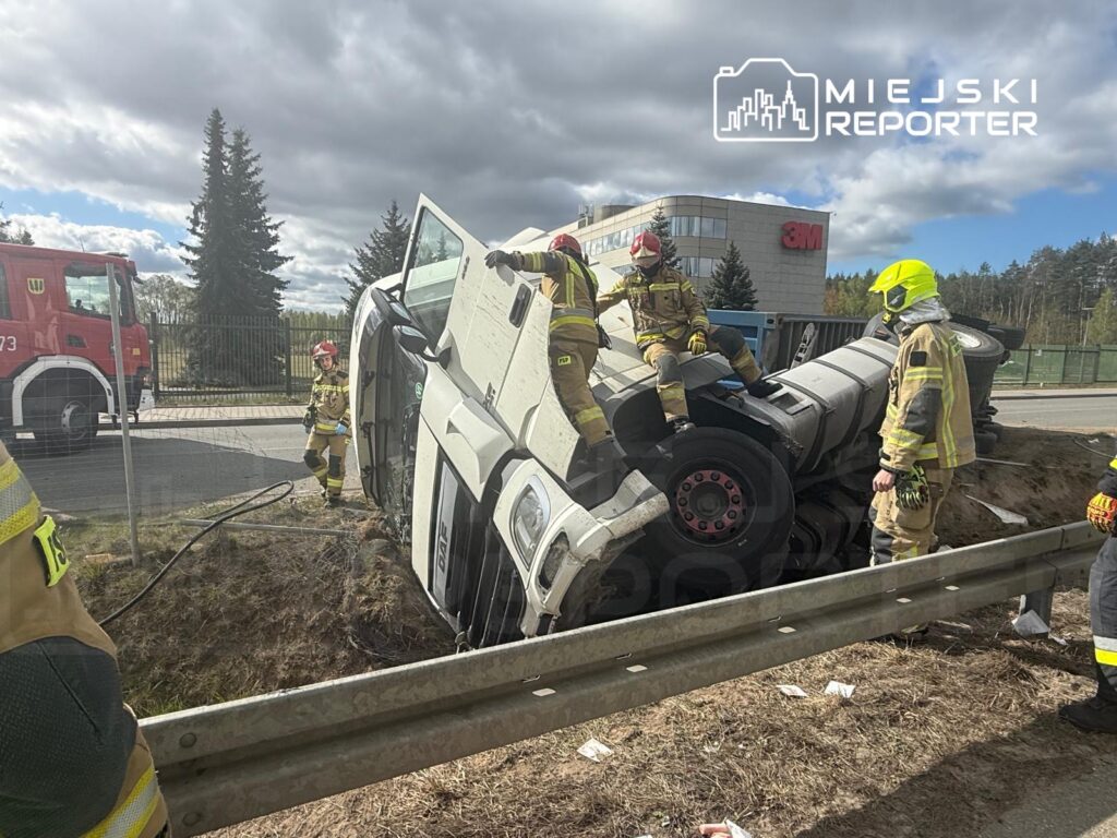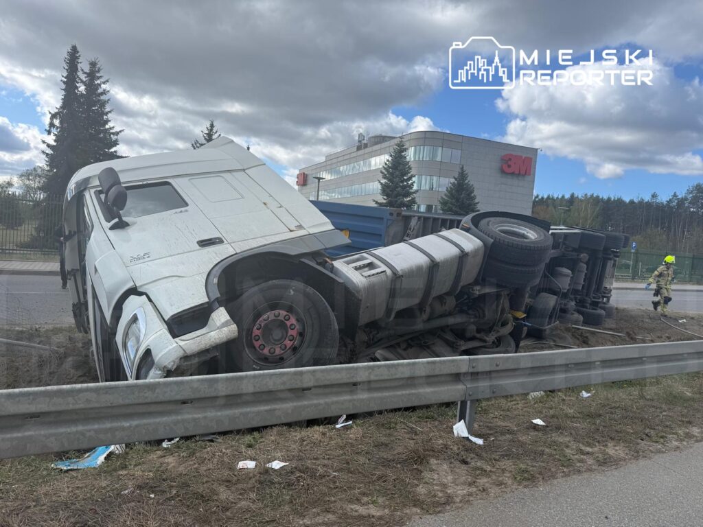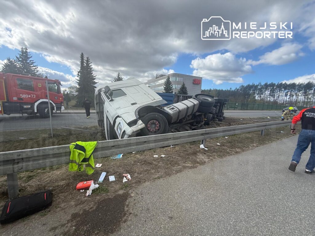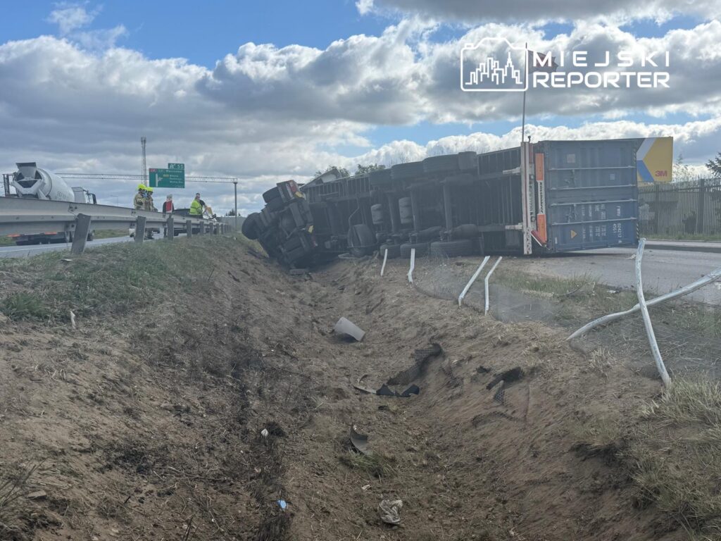 Ciężarówka zjechała z głównej jezdni trasy S8, przebiła bariery energochłonne i przewróciła się na bok na nitce technicznej.