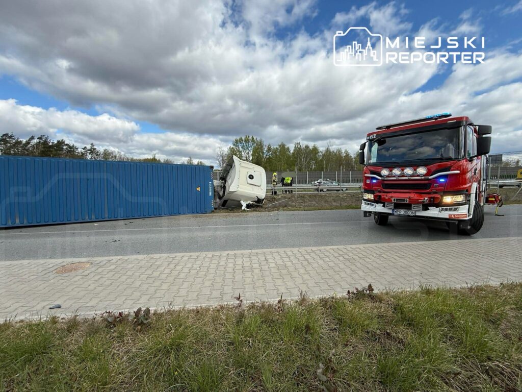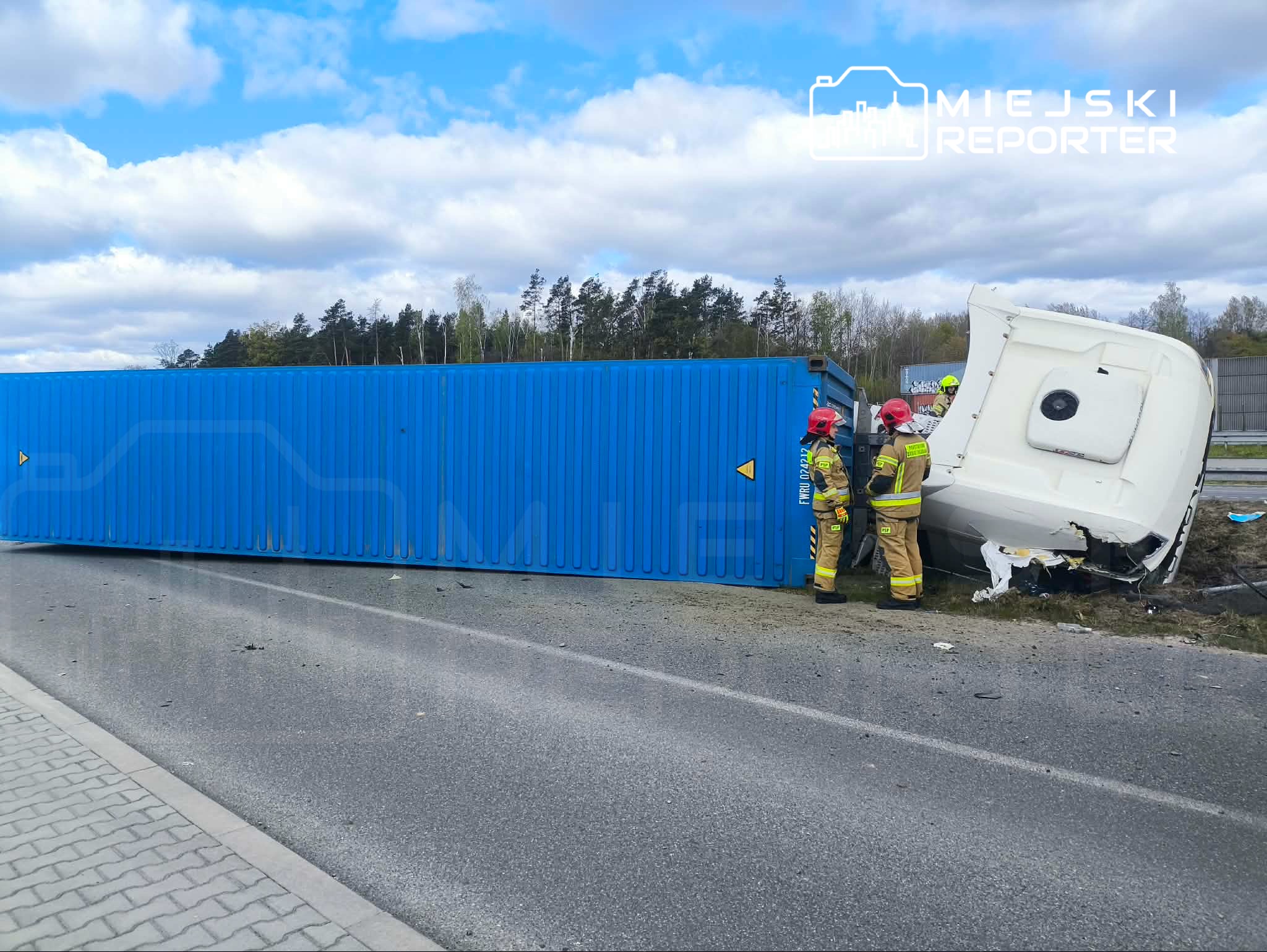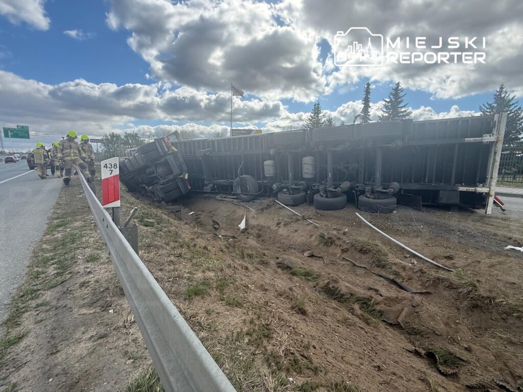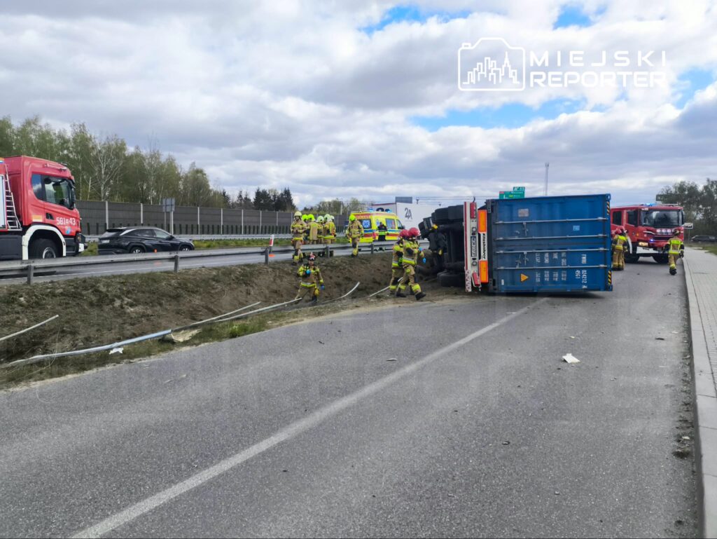 Ciężarówka zjechała z głównej jezdni trasy S8, przebiła bariery energochłonne i przewróciła się na bok na nitce technicznej.