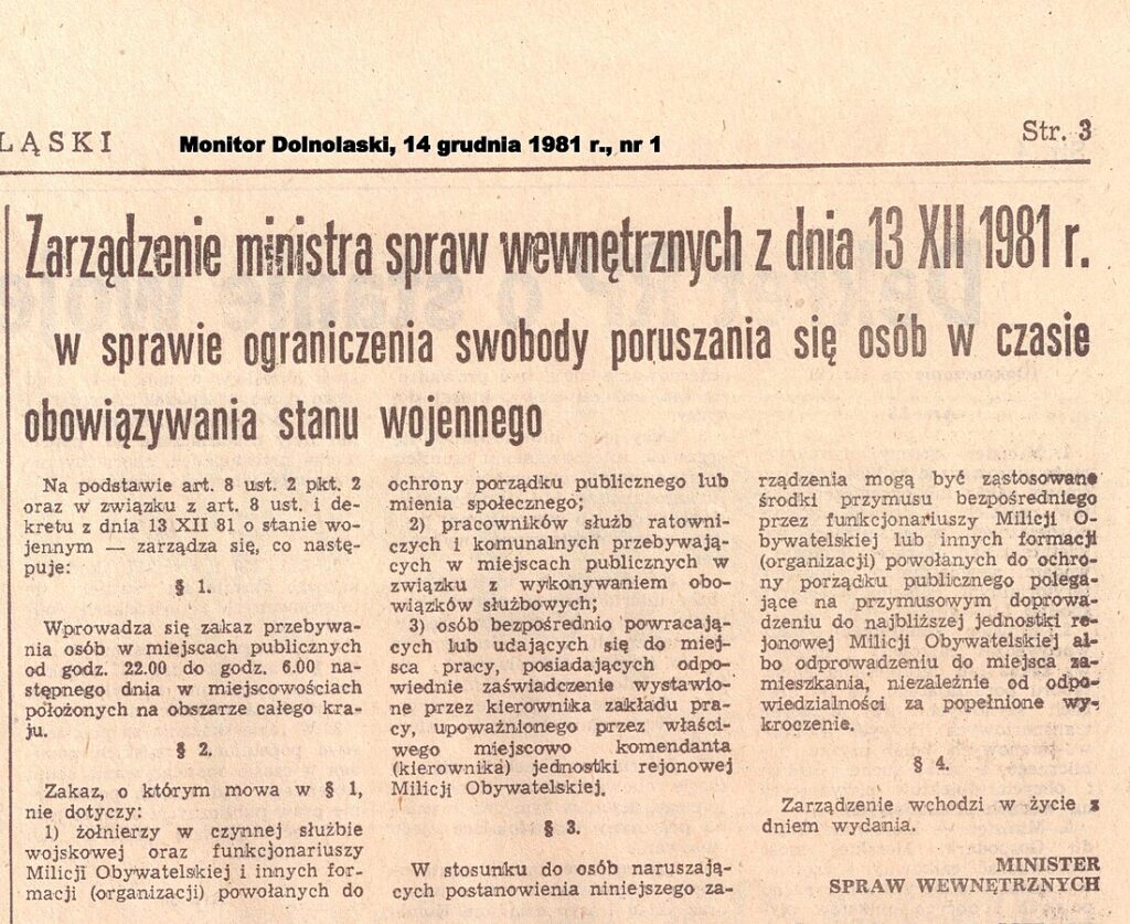 O godz. 6.00 rano Polskie Radio i Telewizja Polska nadały wystąpienie gen. Wojciecha Jaruzelskiego, w którym poinformował on o powołaniu “WRON” oraz wprowadzeniu stanu wojennego. Równolegle trwały już prowadzone w całym kraju operacje milicyjno–wojskowe. W ich ramach, na podstawie wcześniej przygotowanych list, zatrzymywano działaczy „Solidarności” i opozycji, blokowano siedziby związku, aresztowano i internowano kluczowe osoby w regionie. W akcji uczestniczyły dziesiątki tysięcy żołnierzy i funkcjonariuszy. W miastach rozlokowano setki czołgów i wozów bojowych – taki obraz potwierdzają zarówno dokumenty, jak i relacje świadków.