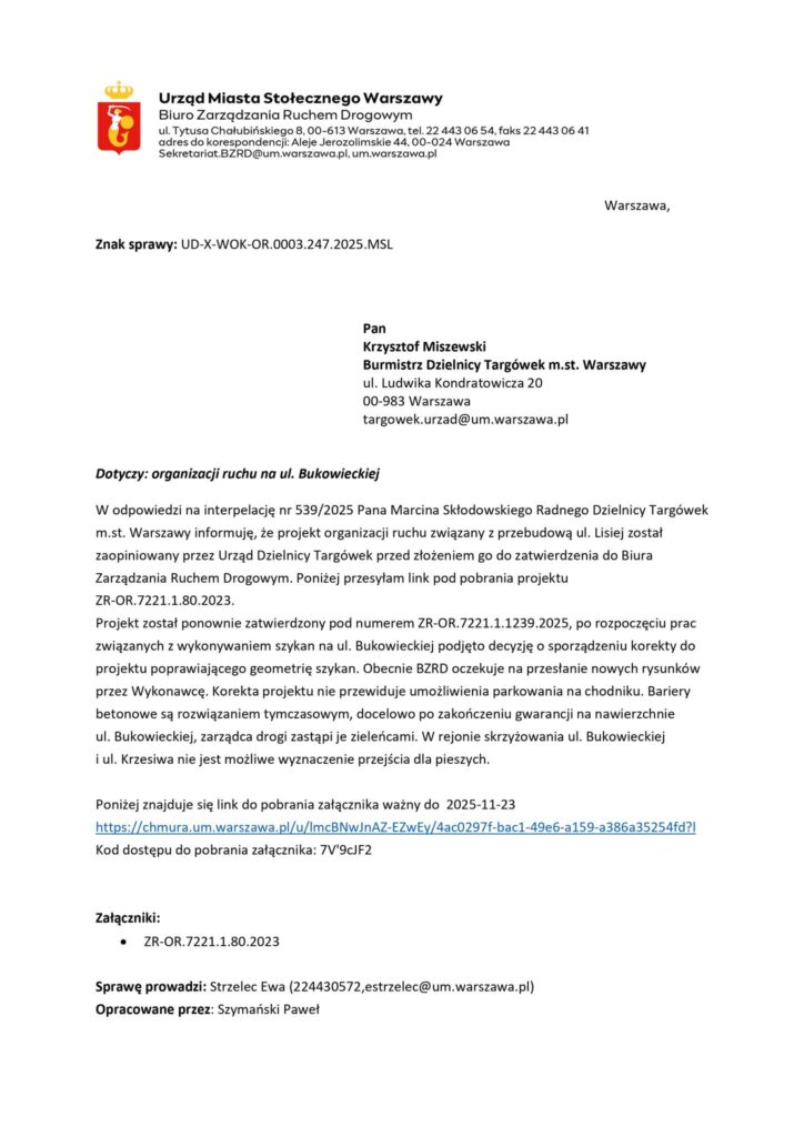 WRZESIEŃ – PAŹDZIERNIK: Urzędniczy ping-pong. Gdy na Bukowieckiej pojawiły się pierwsze linie i znaki, zacząłem zadawać pytania na sesjach Rady. Zarząd Dzielnicy umywał ręce: „To nie my, to Biuro Zarządzania Ruchem Drogowym (BZRD)”. Dokumenty potwierdzają, że projekt organizacji ruchu został zaopiniowany przez Urząd Dzielnicy Targówek przed złożeniem do zatwierdzenia. Wiedzieli, zaopiniowali pozytywnie.