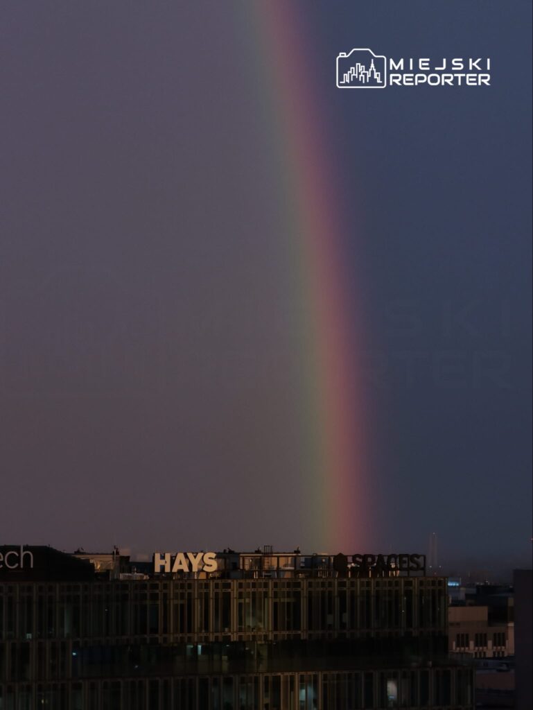 Nisko położone słońce – widoczne w wąskim pasie między horyzontem a krawędzią chmur – oświetliło utrzymujące się nad miastem warstwy zachmurzenia i opady deszczu. W efekcie w kierunku wschodnim utworzyła się wyraźna tęcza, która utrzymywała się aż do zachodu słońca. Równocześnie po stronie zachodniej nieba dominowały odcienie żółci i czerwieni, tworząc mocny kontrast z ciemniejszymi chmurami.