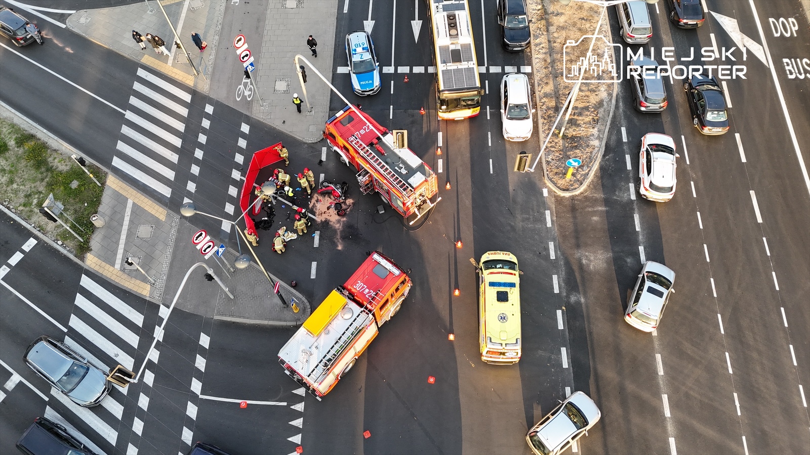 Potem około godziny 16.00 poważny wypadek Hondy i Volvo. Z ustaleń z miejsca wynika, że kierowca Volvo wykonał skręt w lewo z Połczyńskiej w Powstańców Śląskich mimo zakazu, po czym doszło do zderzenia i uszkodzeń pojazdów oraz infrastruktury. Do szpitala trafiły dwie osoby. W publikacji podkreślaliśmy, że to „drugie dziś zdarzenie” wyglądające tak samo – dzień po wypadku z motocyklem.