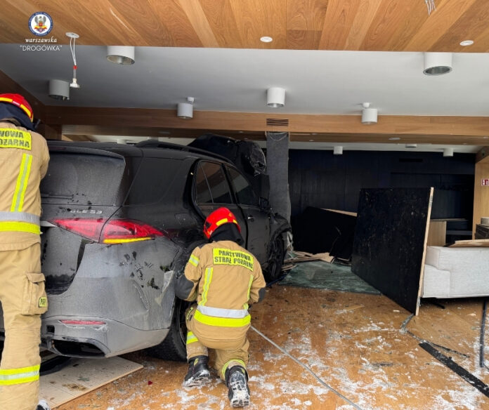 Mercedes wjechał do sklepu z podłogami na Woli