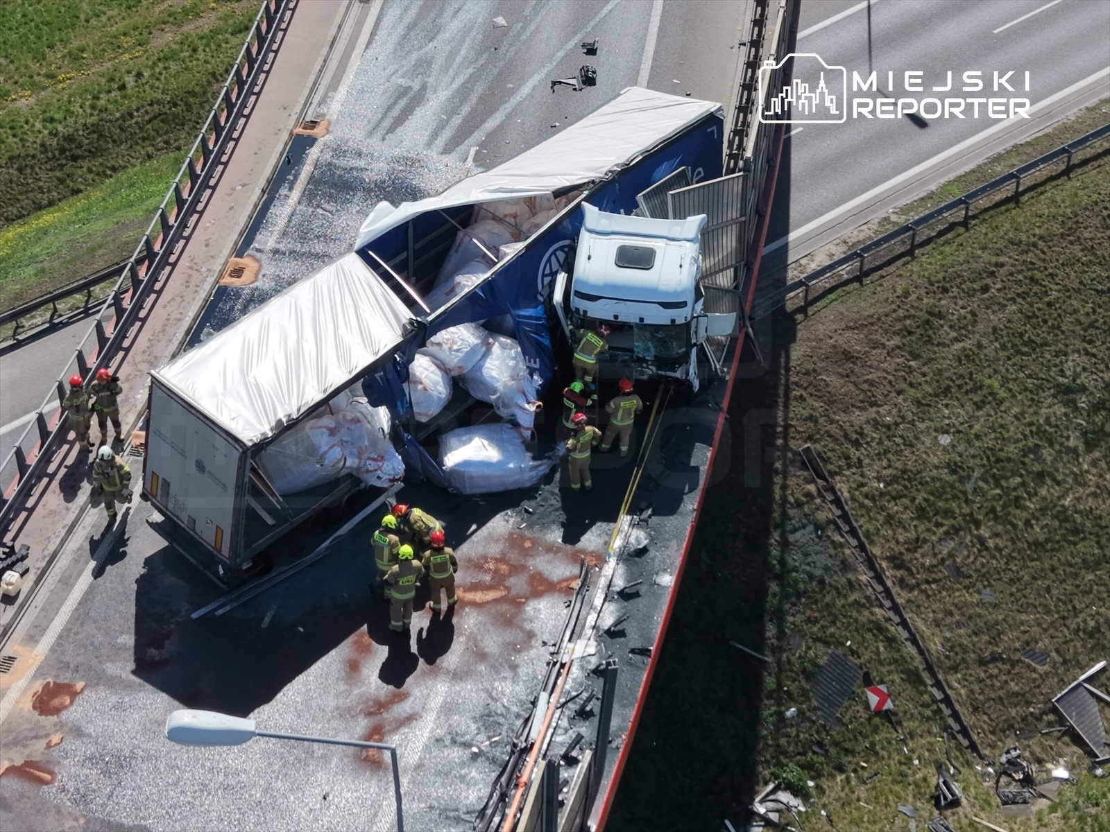 Na miejscu pracowali strażacy, ratownicy medyczni i policjanci. Uszkodzeniu uległy bariery energochłonne oraz ekrany dźwiękochłonne, co oznaczało konieczność prowadzenia dodatkowych działań zabezpieczających i porządkowych. Na jezdni znajdowały się również elementy rozbitej infrastruktury oraz pozostałości po zdarzeniu, co dodatkowo utrudniało przywrócenie przejezdności.