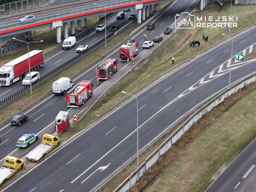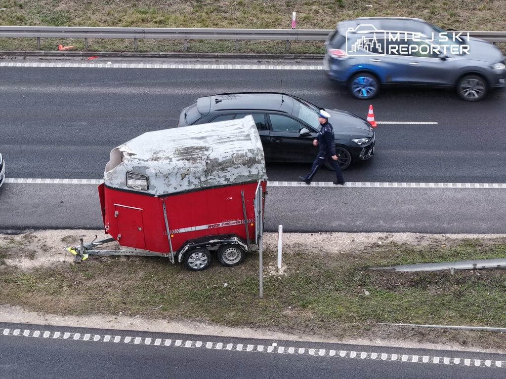Na miejscu pracują policjanci, którzy zabezpieczają teren i nadzorują ruch na trasie. Wraz z opiekunami zwierząt oczekują na przyjazd pomocy drogowej, która ma zabrać uszkodzoną przyczepę i zarazem zapewnić bezpieczny transport koni. Z uwagi na prowadzone działania ratunkowe i techniczne w rejonie węzła Janki zablokowany jest jeden pas w kierunku Warszawy i tworzą się utrudnienia w ruchu, a korek sięga węzła Paszków.