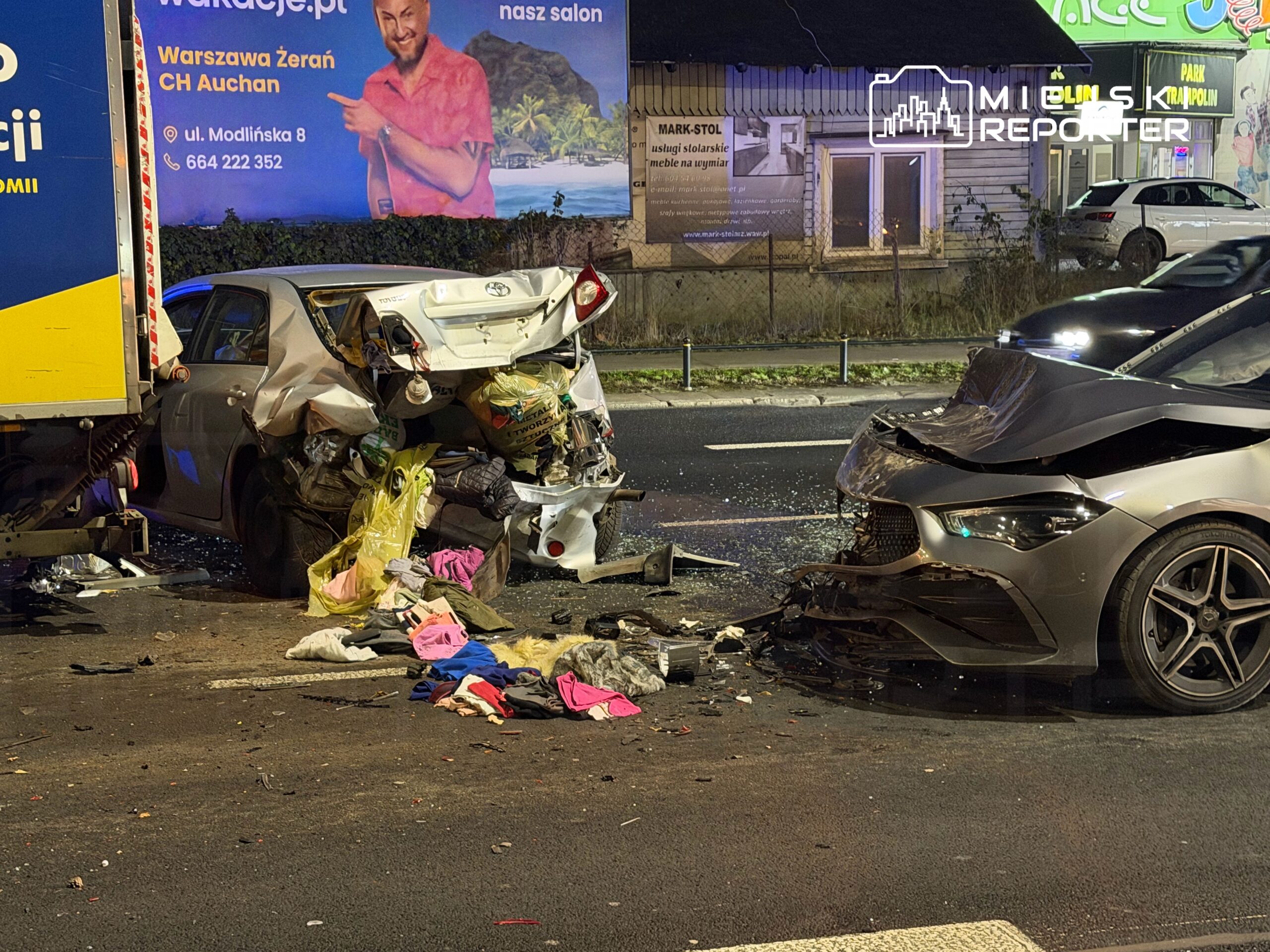 Do zdarzenia doszło na wysokości numeru 115 na ulicy Modlińskiej. Według ustaleń z miejsca kolizji, kierujący mercedesem najechał na tył toyoty, pchając ją dalej na jadący przed nią samochód ciężarowy marki Fuso. Siła uderzenia spowodowała, że auto ciężarowe wpadło następnie na stojącego przed nim opla.