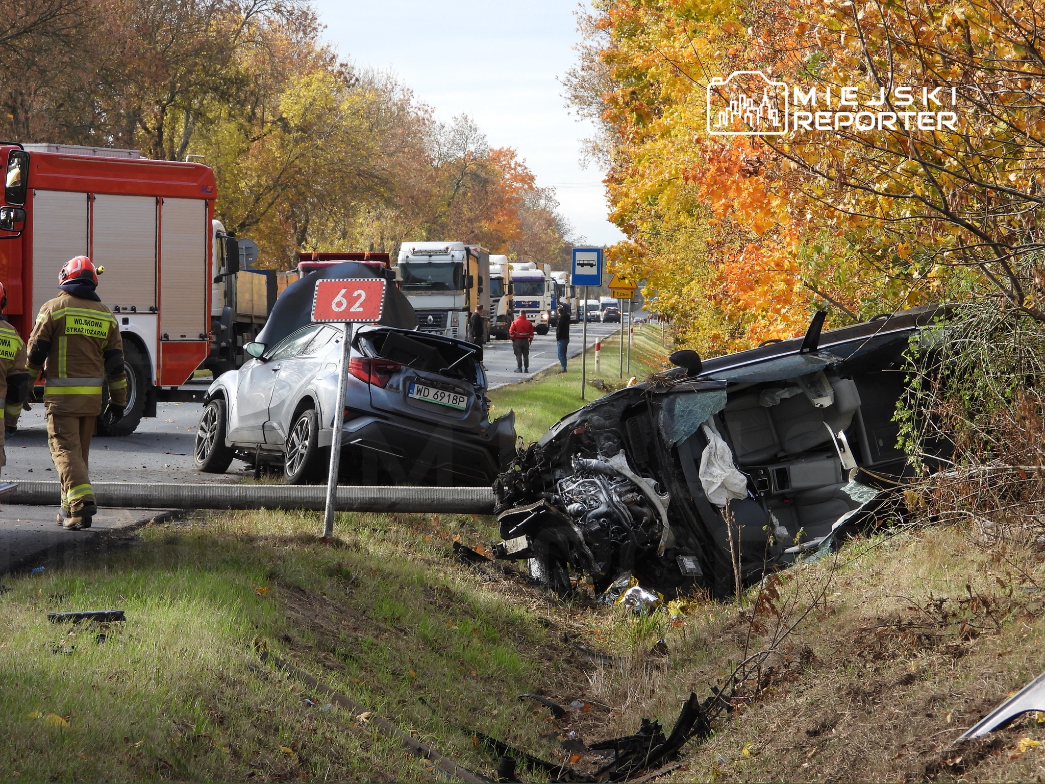 Na DK62 w Karolinie zderzyły się Toyota i Audi, po czym drugie auto dachowało do rowu. 48-letni kierowca Audi został przetransportowany śmigłowcem LPR, a 32-latek z Toyoty trafił do szpitala drogą lądową; na miejscu trwają policyjne czynności i obowiązują objazdy.