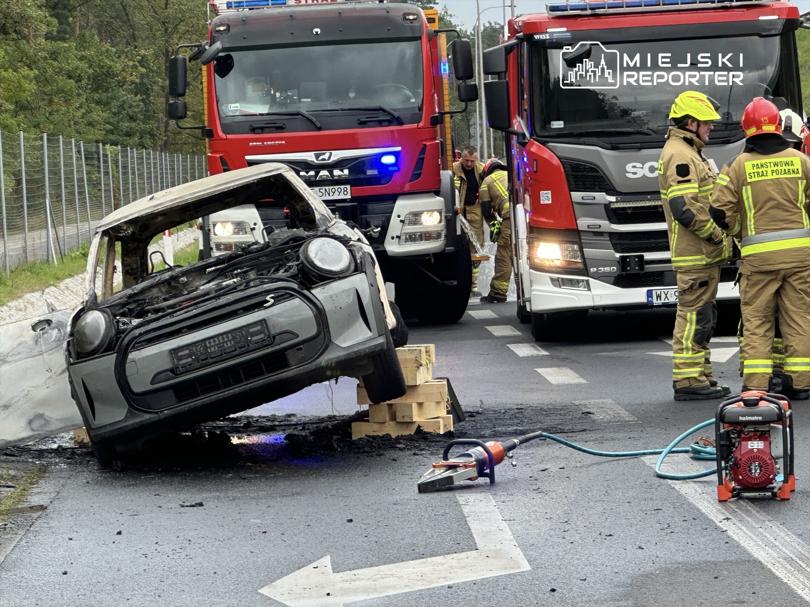 Na zjeździe z ul. Żołnierskiej w ul. Czwartaków zapalił się elektryczny Mini Cooper. Ogień szybko ugaszono, ale zjazd był zablokowany do ok. godz. 14 z uwagi na wielogodzinny monitoring baterii.
