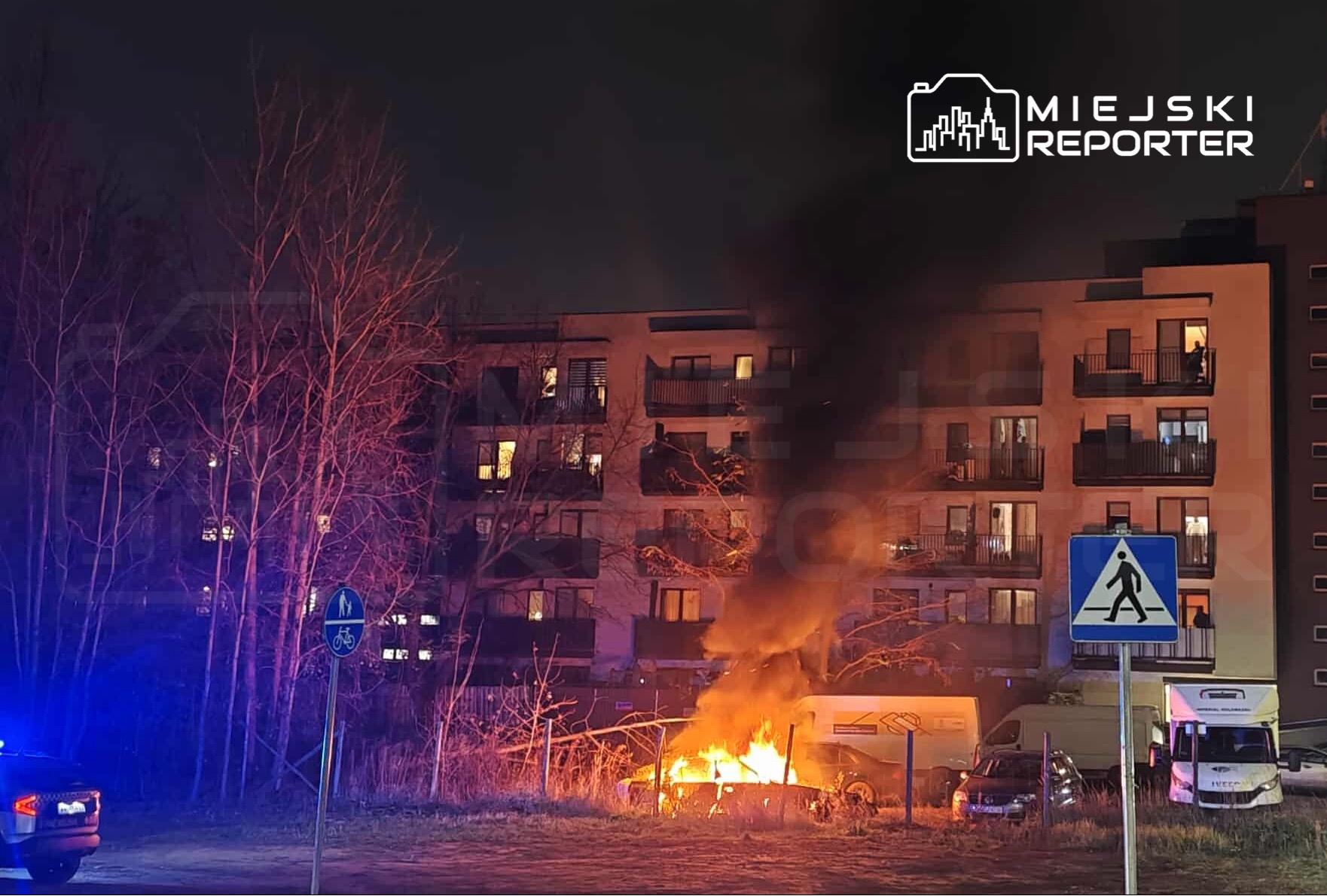 Ogień trawi samochód zaparkowany przy nowoczesnym budynku mieszkalnym, w tle widoczne są zapalone okna.
