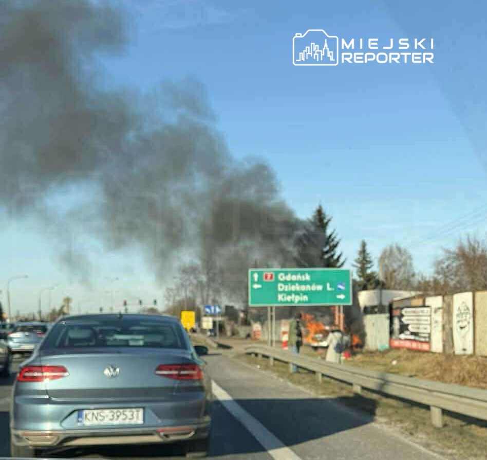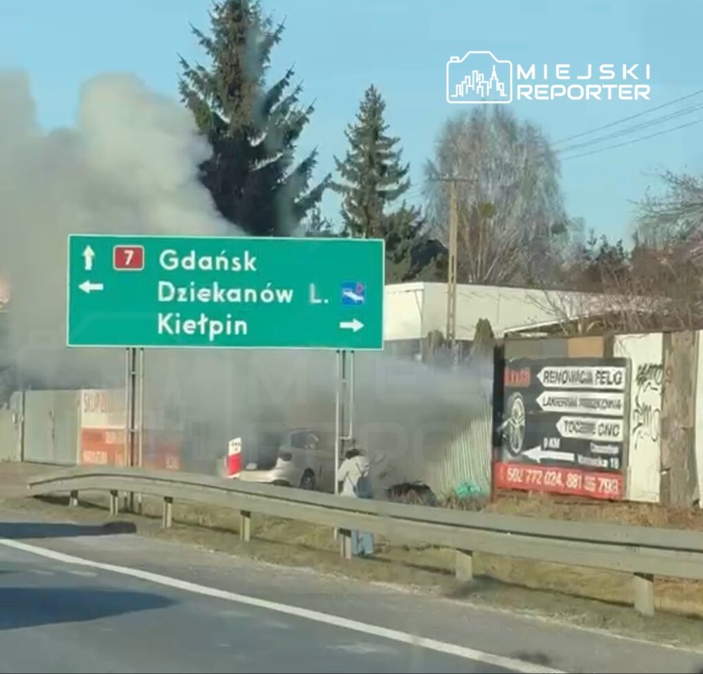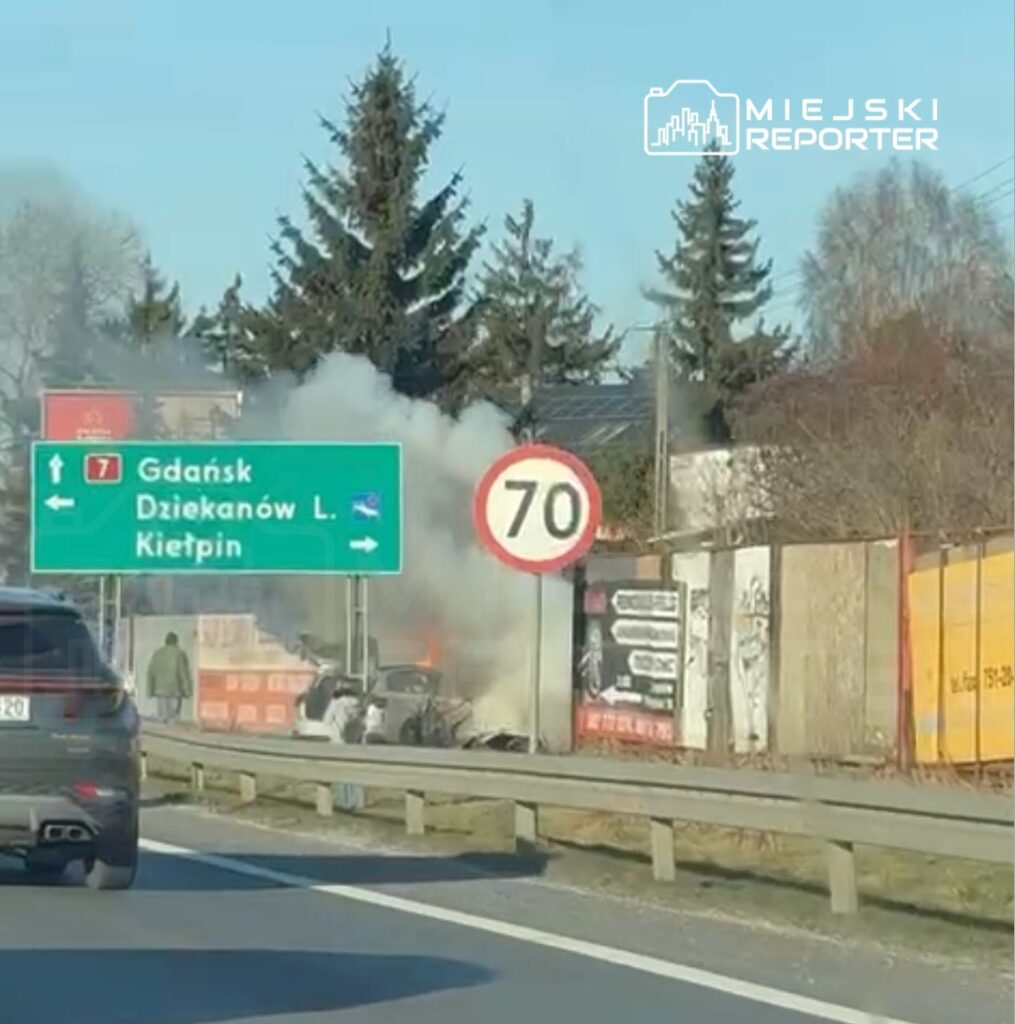 Pożar taksówki na DK7. Ogień przedostał się na teren skupu złomu. Trwa akcja gaśnicza. Duże utrudnienia