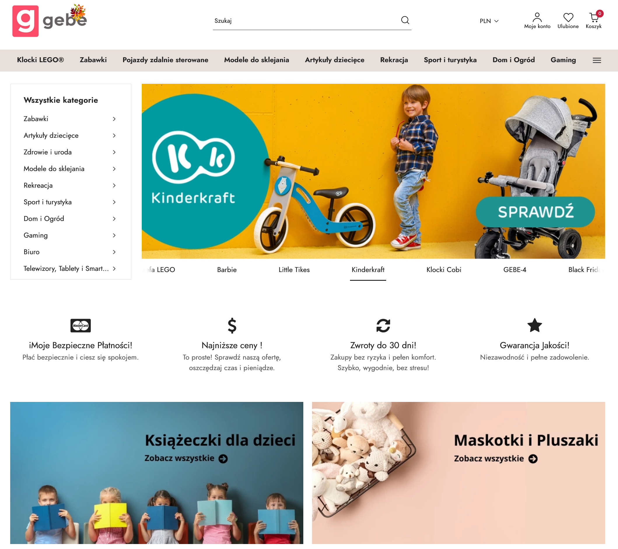 Na stronie głównej sklepu gebe.com.pl wciąż dostępna jest pełna oferta handlowa. Sklep prezentuje się jako sprzedawca zabawek dla dzieci, modeli do sklejania, pojazdów zdalnie sterowanych, akcesoriów dla dzieci, a także drobnego sprzętu AGD i akcesoriów kuchennych. W opisie eksponowane są szeroki wybór, atrakcyjne ceny oraz hasła dotyczące bezpieczeństwa płatności.