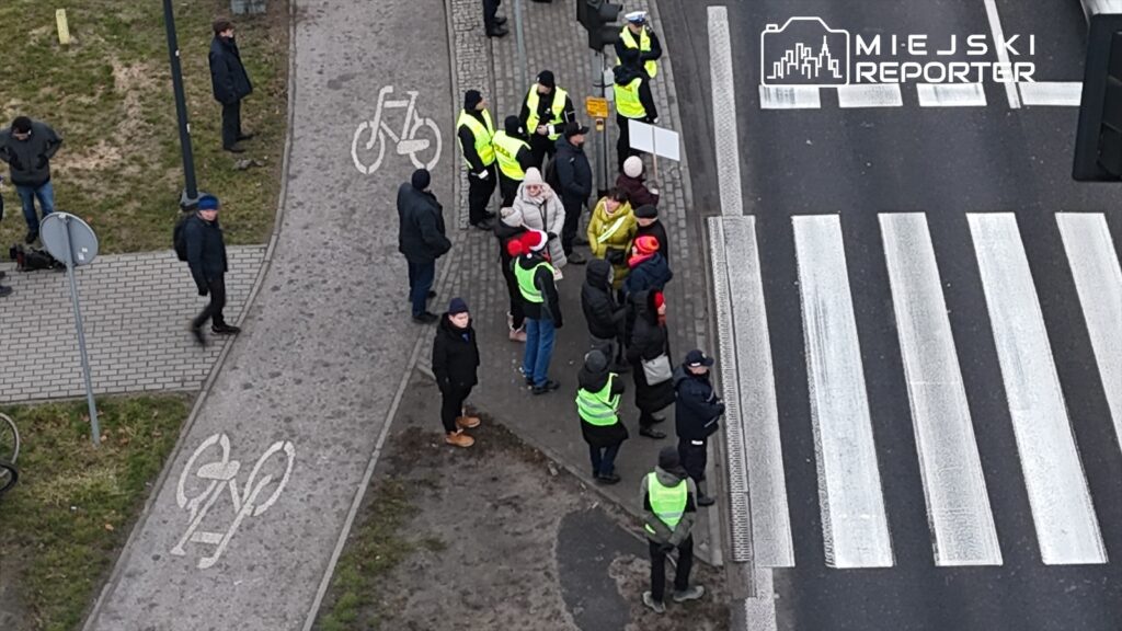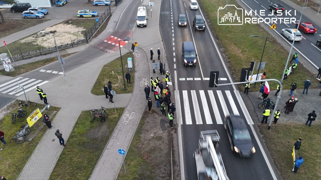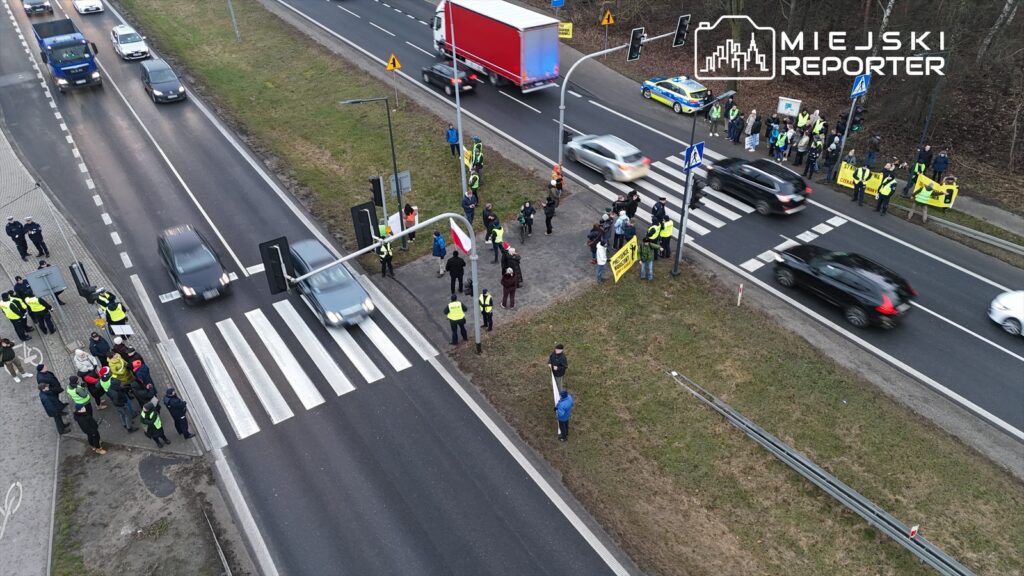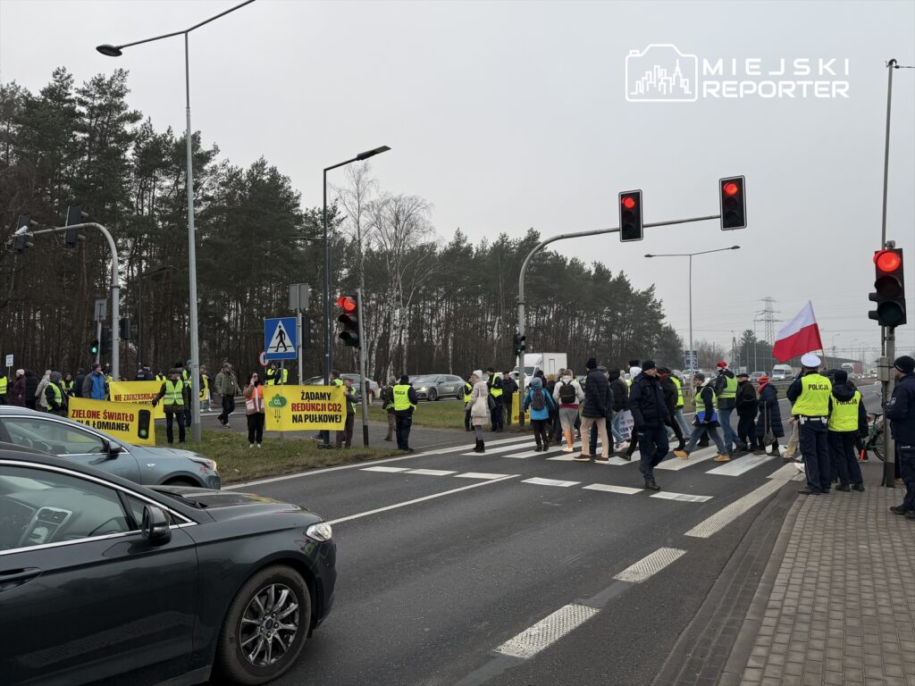 Na miejscu protestujący trzymają transparenty i przechodzą przez przejście dla pieszych na zielonym świetle respektując przepisy. Wśród widocznych haseł są m.in. „Zielone światło dla Łomianek”, „Prezydencie Warszawy prosimy o reakcję”, „Zapytajcie prezydenta dlaczego wszyscy tu stoimy” oraz „Tak dla buspasa na Pułkowej”. Obecność policji koncentruje się na zabezpieczeniu protestu, ewentualnym kierowaniu ruchem w rejonie przejścia oraz na dojazdach od strony Warszawy.