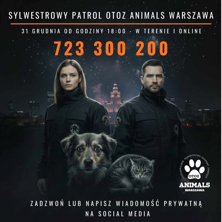 Sylwestrowa noc to dla wielu psów i kotów czas ogromnego stresu. Huk petard powoduje panikę, ucieczki i zaginięcia zwierząt. W Warszawie tej nocy nie zostaną same – od godziny 18:00 rozpoczyna działanie Sylwestrowy Patrol Animalsów OTOZ Animals.