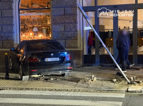 W środę 17 grudnia 2025 roku wieczorem na ul. Marszałkowskiej, w rejonie placu Zbawiciela w Śródmieściu, doszło do zdarzenia drogowego z udziałem samochodu osobowego marki BMW, który uszkodził elementy infrastruktury oraz uderzył w fasadę budynku; interwencja służb spowodowała czasowe...