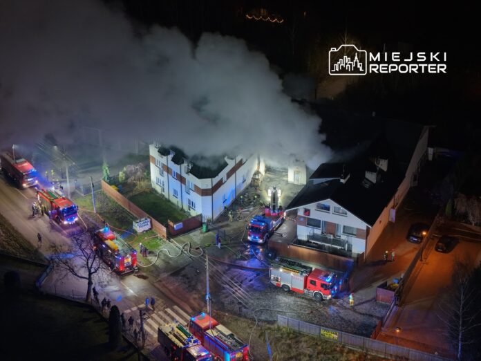Duży pożar budynku warsztatowego. Z ogniem walczy blisko 15 zastępów straży pożarnej