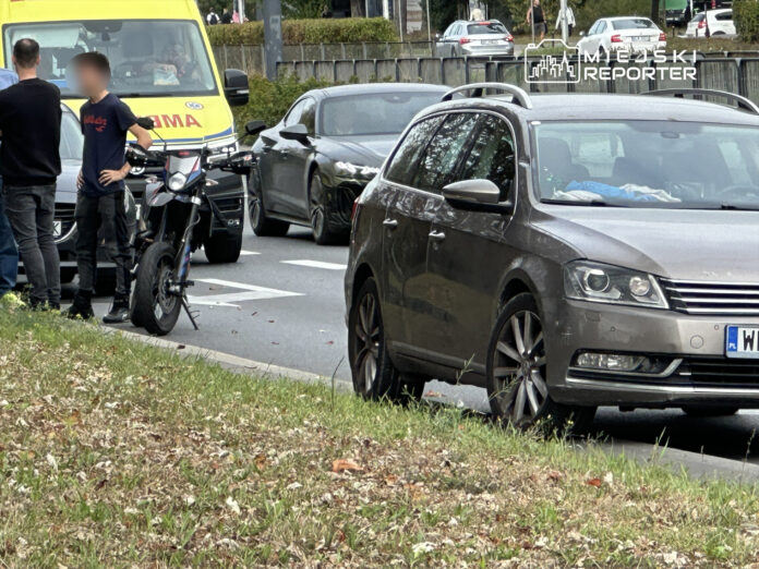 Zderzenie motocykla z VW na Wołoskiej. Jedna osoba w karetce