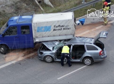 Zasnął za kierownicą i osobówką wbił się w tył dostawczaka na S2. Ranny 28-latek. Pomógł policjant jadący na służbę