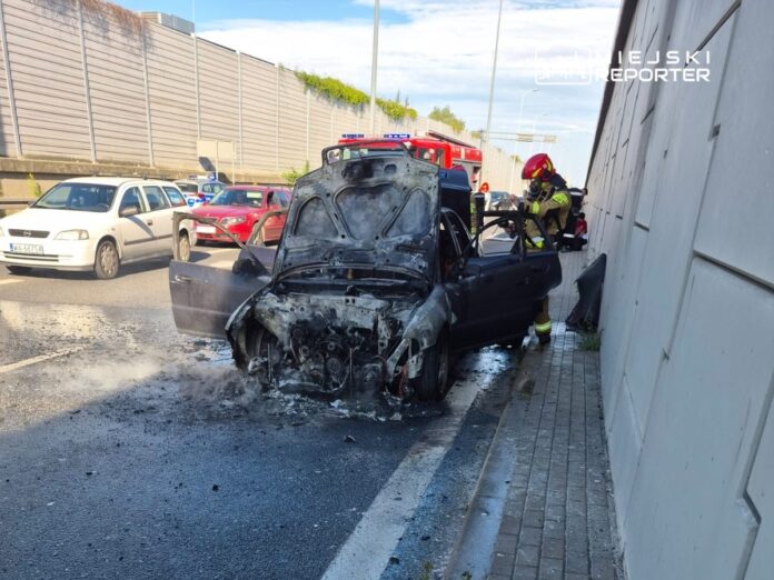 VW New Beetle stanął w płomieniach na wyjeździe z Warszawy. Zablokowany przejazd w kierunku Pruszkowa