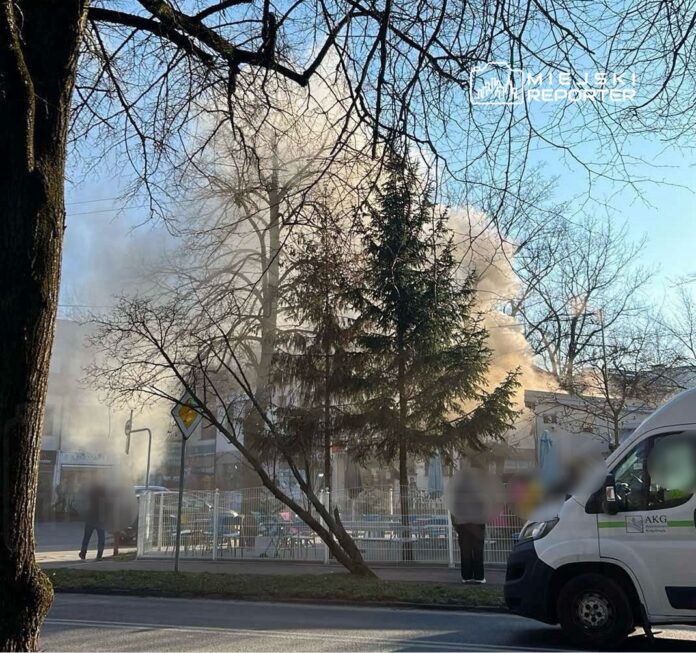Pożar pawilonu handlowego pod Warszawą. W akcji gaśniczej 4 zastępy straży pożarnej. Paliło się 20 metrów poddasza