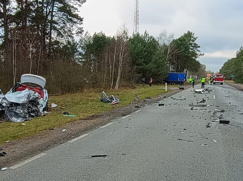 Czołowe zderzenie ciężarówki z osobówką. Auto osobowe zmiażdżone. Droga zablokowana