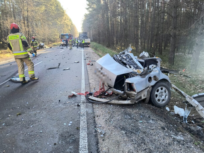 Wjechał w tył ciężarówki, a następnie uderzył czołowo w busa. Volkswagen rozleciał się na pół. Dwie osoby w ciężkim stanie