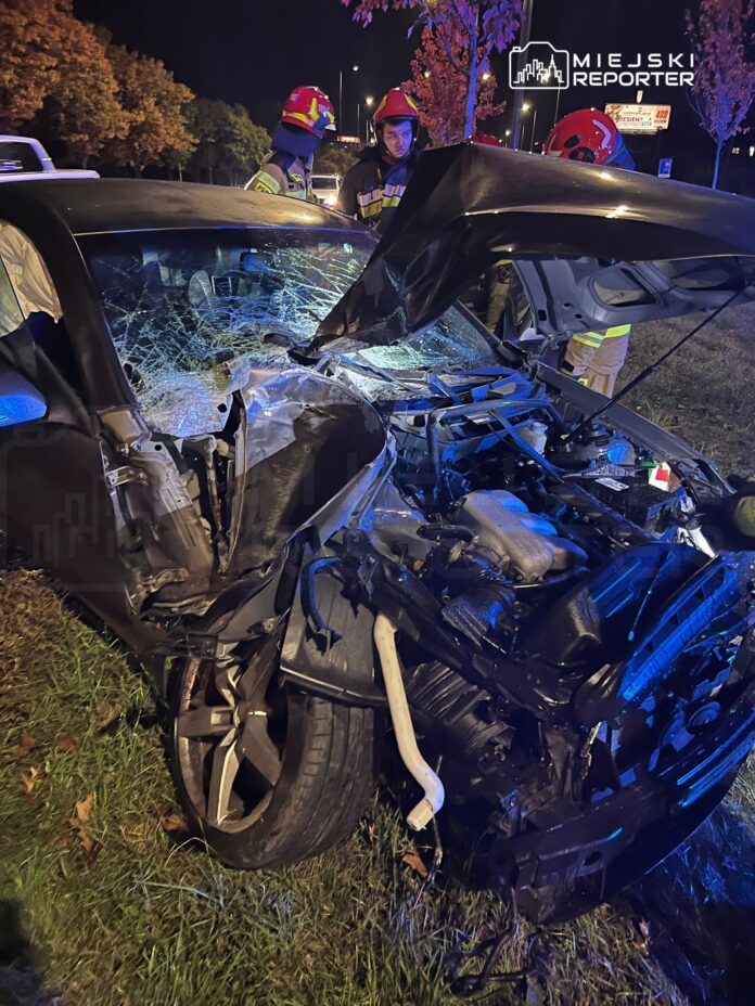 Kierujący samochodem osobowym wpadł w poślizg, ściął drzewo i uderzył w słup na Białołęce