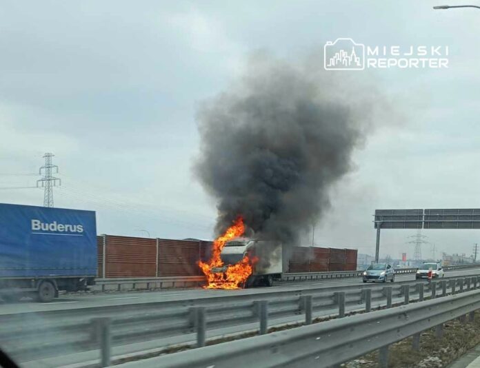Pożar auta dostawczego na trasie S7. Pojazd objęty jest cały ogniem