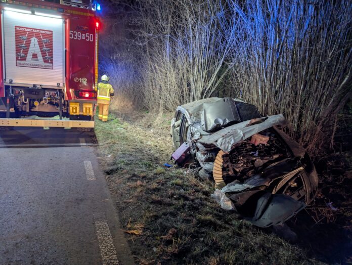 Pijany kierowca uderzył w drzewo. Dwie osoby były zakleszczone w aucie