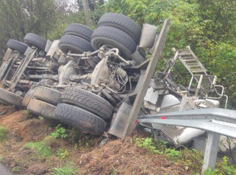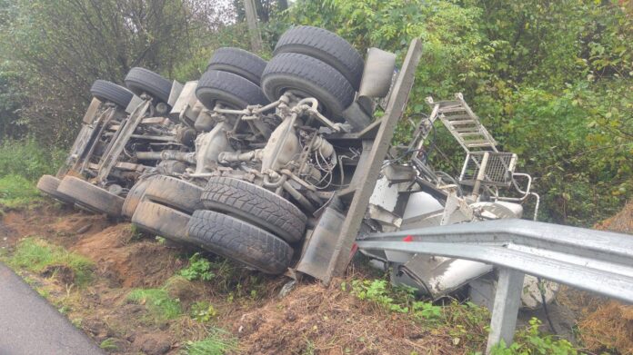Mijanie dwóch ciężarówek zakończone wywrotką “gruszki”