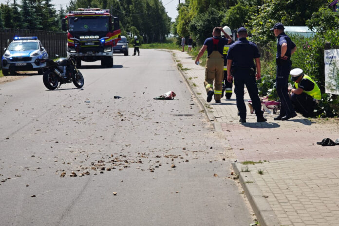 82-letni rowerzysta wyjechał z posesji prosto pod jadący motocykl. Doszło do wypadku. Rowerzysta jest w stanie ciężkim