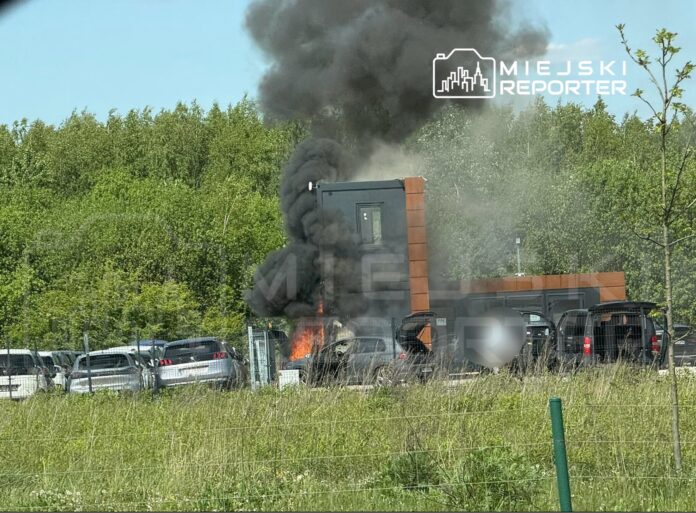 Pożar na parkingu w pobliżu Lotniska Chopina. Spaliło się parkingowe biuro
