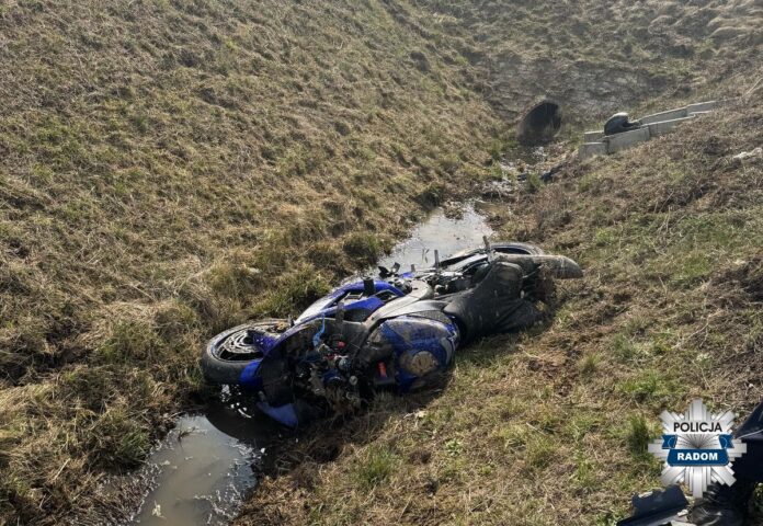 Poważny wypadek motocyklisty. Kierujący jednośladem na łuku wypadł z drogi i wjechał do rowu. Stan mężczyzny jest ciężki