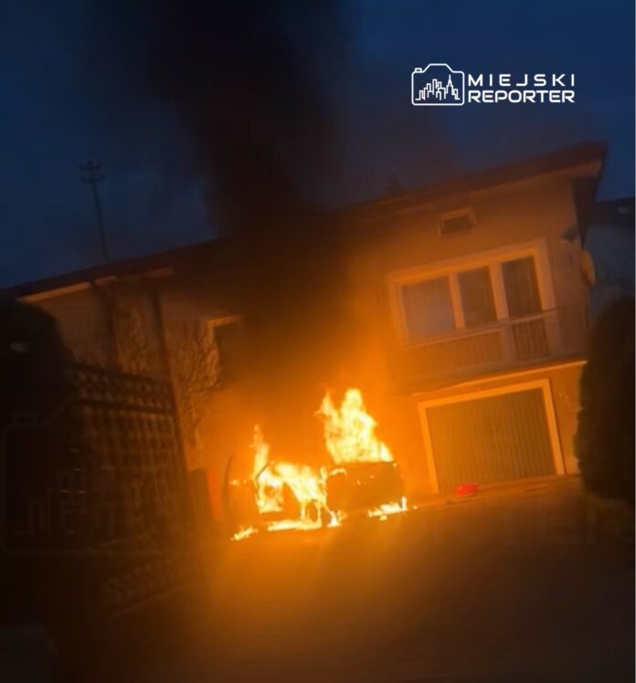 Pożar samochodu na posesji. Pojazd był cały w ogniu