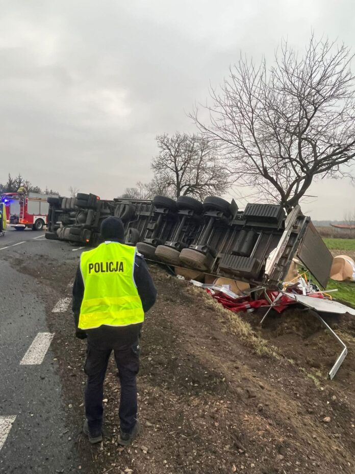 Kierujący ciężarówką stracił panowanie. Pojazd przewrócił się na bok