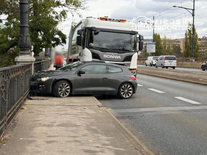 Zderzenie osobówki ze śmieciarką na Moście Poniatowskiego w Śródmieściu