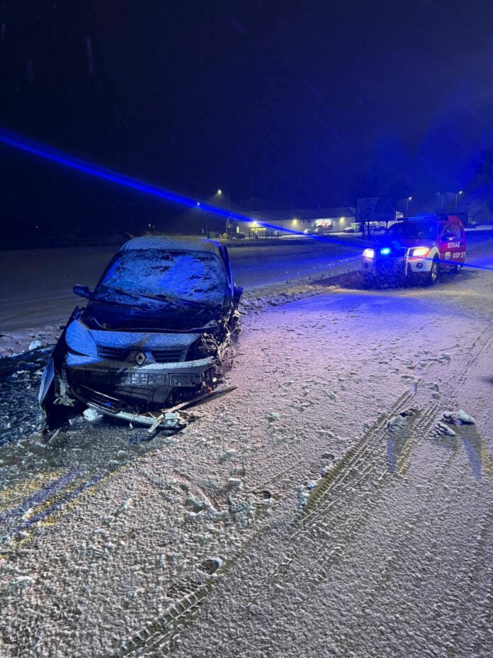 Zderzenie czołowe dwóch aut na zaśnieżonej drodze. Trzy osoby ranne