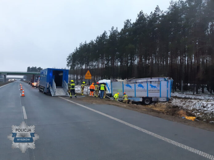 Dachowanie ciężarówki z bydłem na trasie S8. Kierowca jest nietrzeźwy!