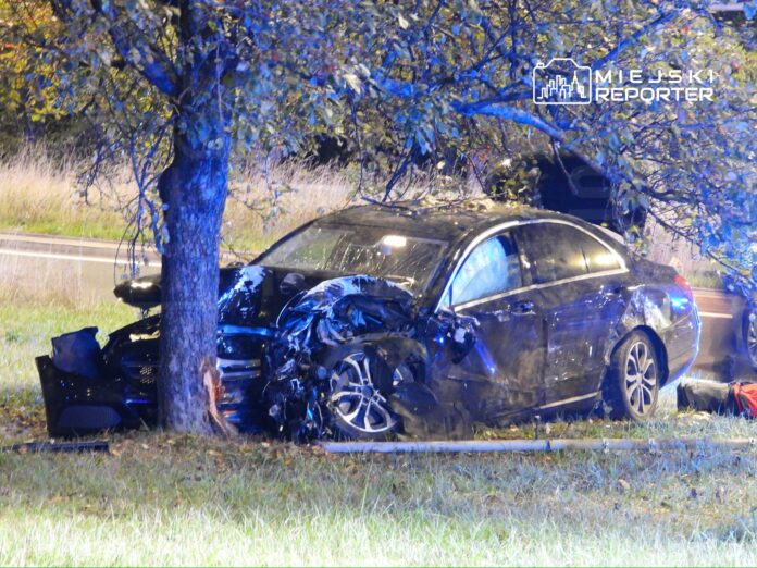 Pijany kierowca Mercedesa wjechał w filar wiaduktu, odbił się i uderzył w drzewo