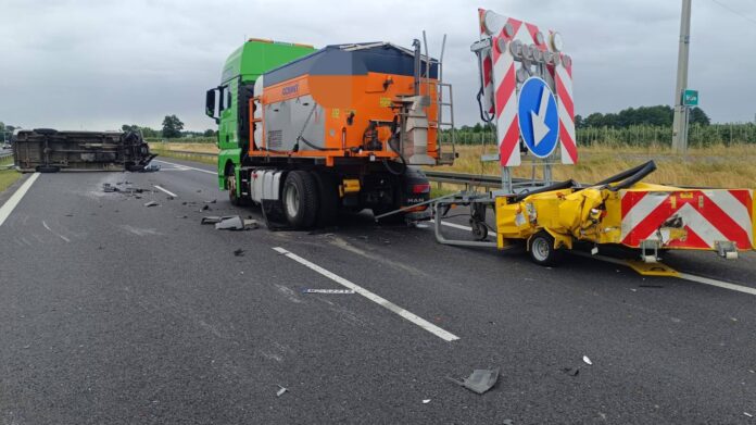 Poważny wypadek na trasie S7. Busem wjechał w drogowców. Pojazd wywrócił się na bok. Droga zablokowana