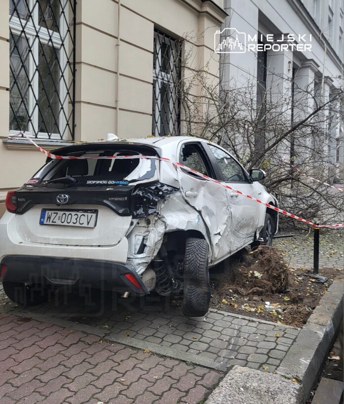 Pijany 21-letni kierowca wjechał Mercedesem w zaparkowane auto na Wilczej. Pojazd uderzył w drzewo i zawisł na pniu. Kierowca miał ponad 1,7 promila