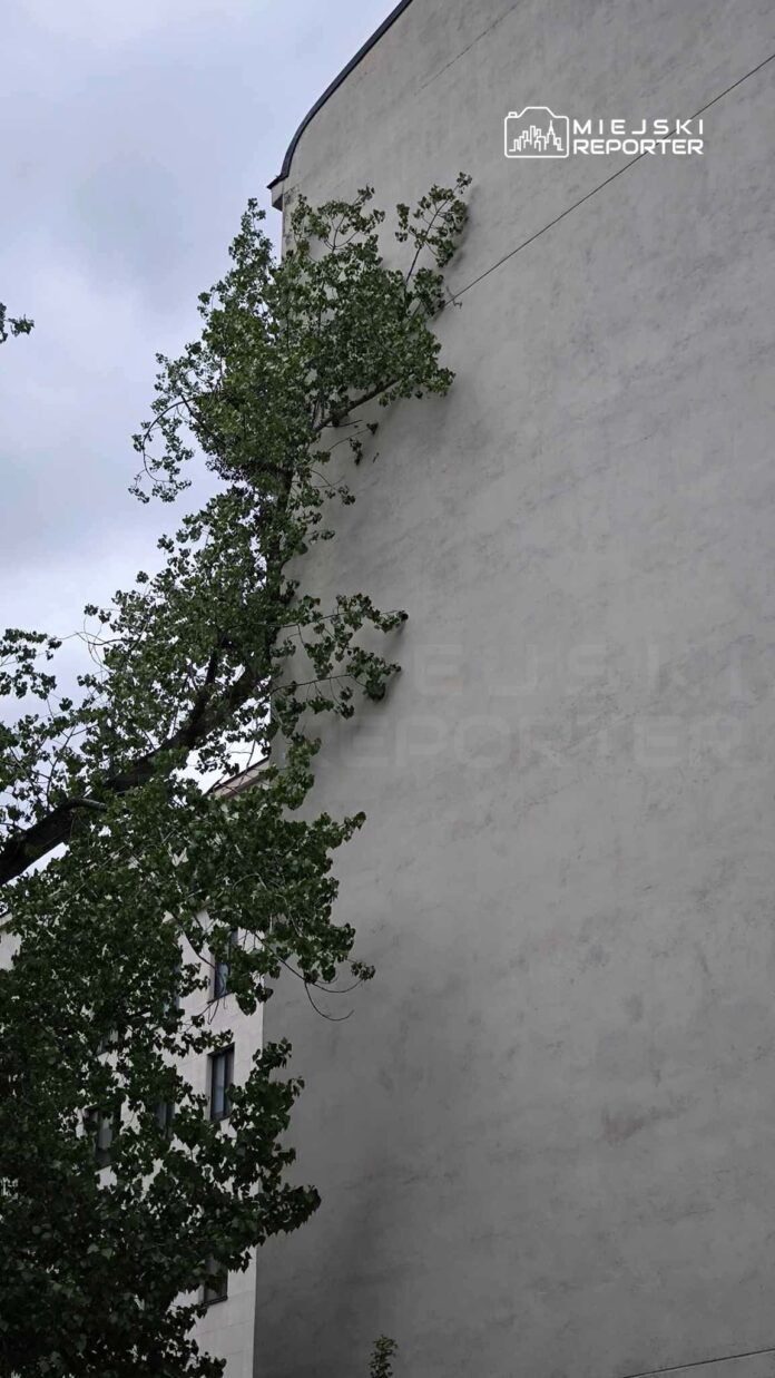 Gałąź oparła się o budynek Sądu Okręgowego. Na czubku gałęzi było gniazdo z pisklęciem
