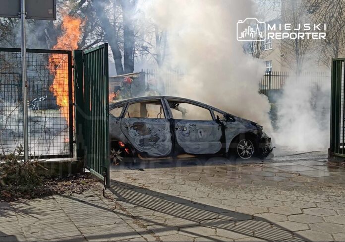 Pożar toyoty prius na Woli. Auto objęte jest całe ogniem