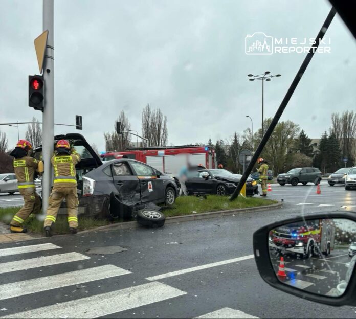 Poważne zderzenie dwóch aut na Ursynowie. Auto przewozu osób po zderzeniu wjechało w słup
