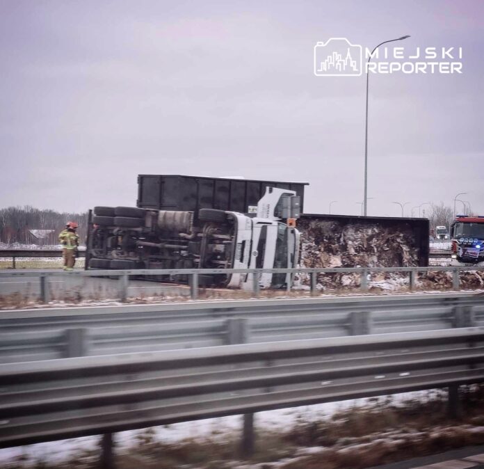 Ciężarówka przewożąca śmieci wywróciła się na bok na trasie S7 na Ursynowie