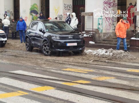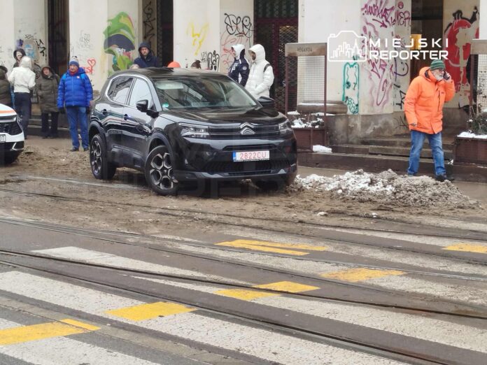 Zaparkował Citroenem w miejscu niedozwolonym i zablokował ruch tramwajowy. Pasażerowie ręcznie próbowali przestawić auto