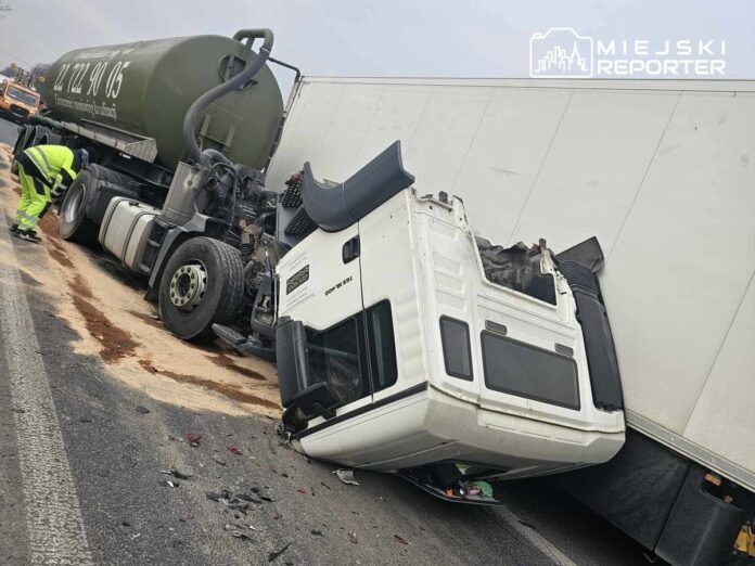 Trzy ciężarówki zderzyły się na DK92. Z jednej aż odpadła kabina