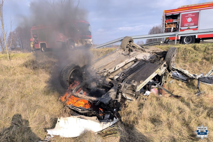 Pościg zakończony wypadkiem. 21-latek dachował, a pojazd stanął w ogniu. Mężczyzna miał zabrane prawo jazdy i posiadał narkotyki